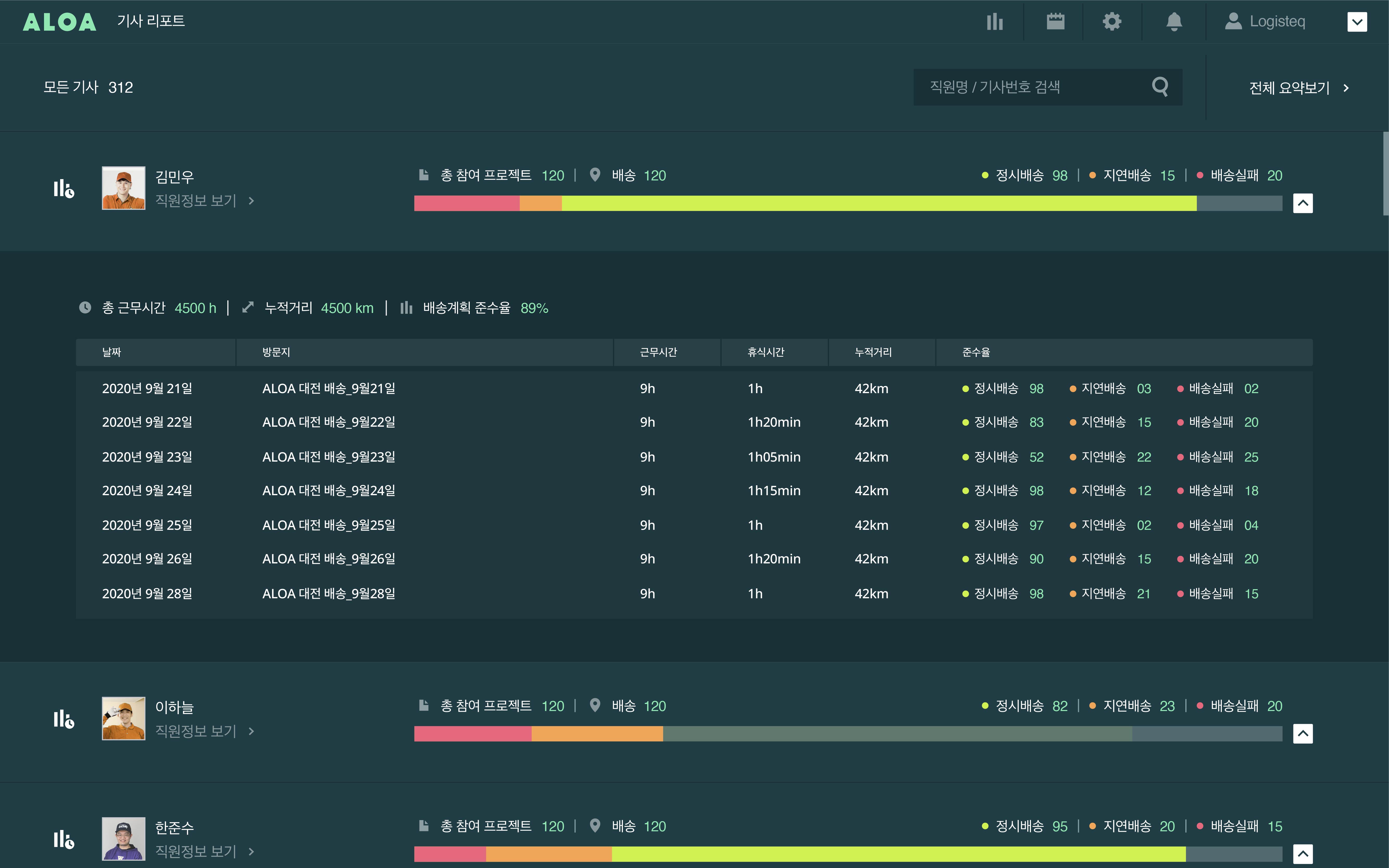 기사별 업무 시간 및 업무 수행 준수율, 배송 소요시간 등의 실적 리포트를 통해 기사 업무의 정성적, 정량적 관리가 이루어집니다.